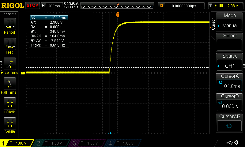 Focusing on Slide #1, the bottom horizontal dotted line represents the 340 mV level, whilst the top horizontal solid line represents the 2.98 V level. The oscilloscope used in this laboratory could not be set at 330 mV and 2.97 V, i.e., 10% and 90%, respectively, of 3.3 V; however, 340 mV and 2.98 V are close enough for representation purposes. The left vertical solid line represents the beginning of the rise time, whilst the right vertical dotted line represents the end of the rise time. The BX-AX represents the rise time of 104 ms. The rise time of the 47 μF capacitor, slide #2, appears to be approximately ten times that of the 4.7 μF capacitor. The rise time of the 470 μF capacitor, slide #3, appears to be approximately ten times that of the 47 μF capacitor.