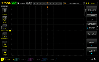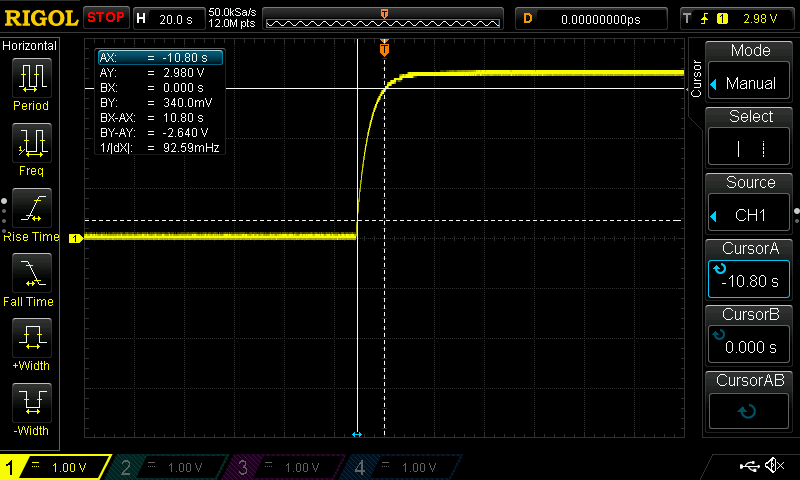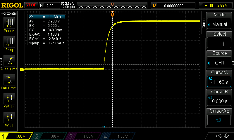 Start by using the 4.7 μF capacitor. Disconnect the red cable from the PSU to disconnect power to the circuit. Press and hold the tactile button for several seconds to ensure that the capacitor is fully discharged. Set the oscilloscope trigger to 200 ms and connect the probe to Test Point 1 (TP1). Connect the red cable to the PSU to connect power to the circuit. Observe the oscilloscope capturing the charge curve of the capacitor. If the curve does not appear cleanly, repeat the above steps and try again. Repeat these steps for the 47 μF and 470 μF capacitors; however, with a 2 s and a 20 s trigger, respectively. Note that to discharge the 470 μF capacitor, the tactile button must be pressed and held down for approximately 20 s. Slides #1 to #3 represent the RC charging curve for a 4.7 μF capacitor, a 47 μF capacitor, and a 470 μF capacitor, respectively.