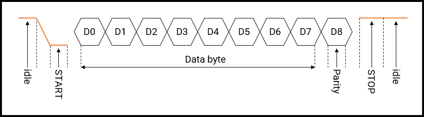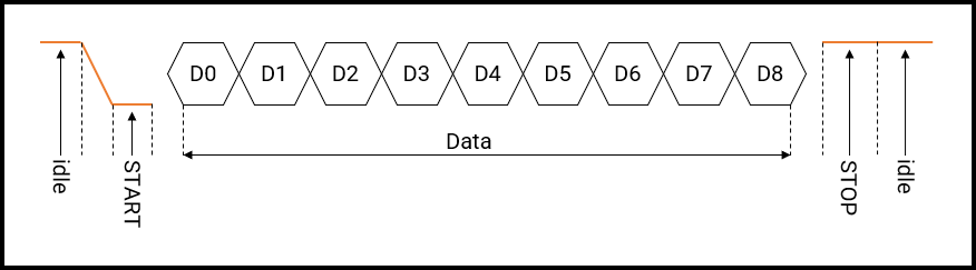 Idle: Before transmission, the communication line on TX is Idle-HIGH, implying that the system is Active-LOW.
