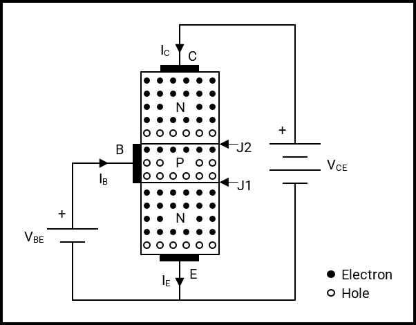 A larger voltage, VCB, than VBE, is applied between the Collector (N) and Base, making the P-N junction, J2, reverse-biased. In other words, “P” is connected to the positive terminal of the voltage source (VBE), while “N” is connected to the positive terminal of the voltage source (VCE). With J2 in reverse-bias, the majority of electrons migrating towards the base, from the Emitter, migrate towards the Collector, crossing over J2, where they migrate towards the (+) terminal of the power source (VCE), creating the Collector current.