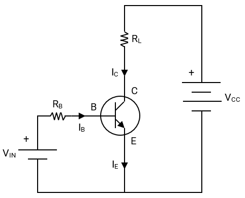 A signal with a small current is applied to the Base, to control a larger current from the Collector to the Emitter. Note that the word current (I) is used to indicate the flow of conventional current, i.e., from a higher potential (+) to a lower potential (-). This is in opposition to the flow of electrons, i.e., from a lower potential (-) to a higher potential (+).