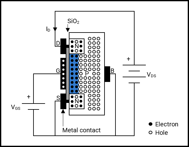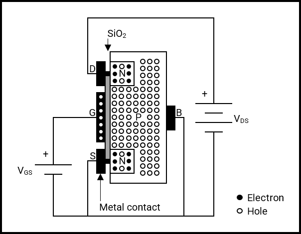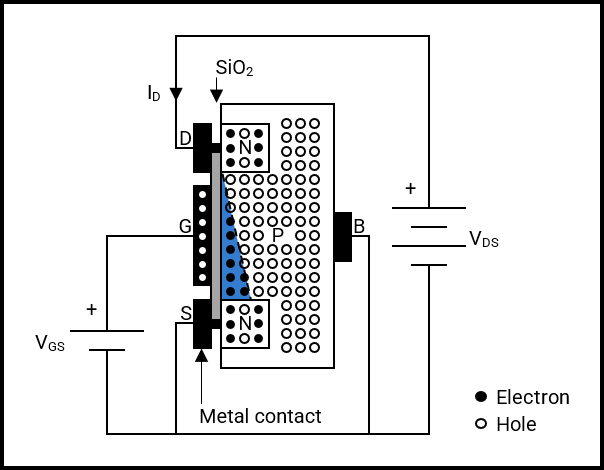 A small voltage, VGS, is applied between the Gate and Source terminals, where the metal contact at the Gate terminal accumulates a positive charge, i.e., holes. The positively charged contact causes free electrons within the N-type material, at the Source terminal, to migrate towards the P-type substrate, filling holes in between the Source and Drain terminals and accumulating adjacent to the silicon dioxide layer. The silicon dioxide layer, separating the positively charged contact from the accumulated electrons, mimics the dielectric material in a capacitor, meaning that no accumulated electrons can reach the contact. This makes the input impedance in a MOSFET very high, leading to the term “Field Effect”.